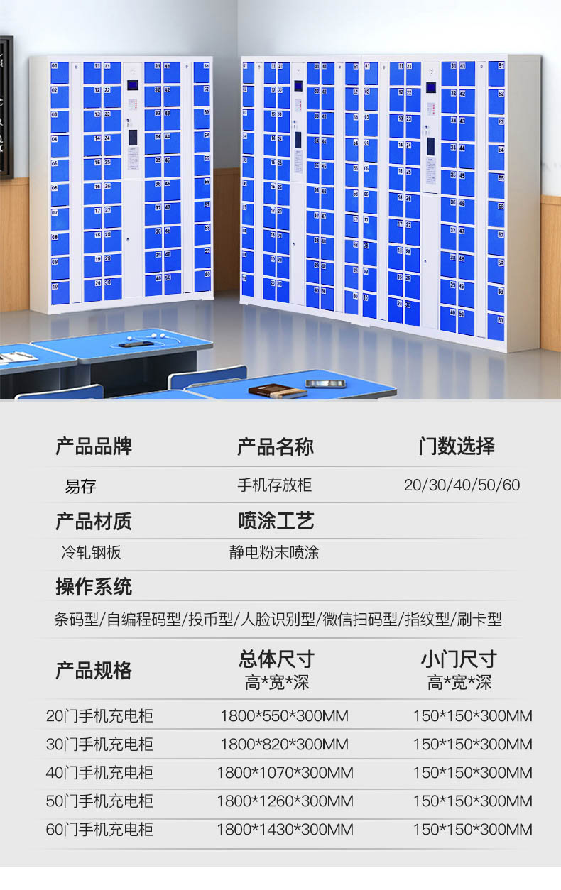 手机存放柜厂家生产手机充电柜! 定制单位,工厂,员工,部队,车间用手机存放柜子 名称:60门智能手机存放柜(格口数可选) 类型:可按客户要求定制,指纹,条码...